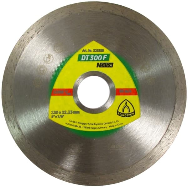 DT 300 F Discuri diamantate de debitare, 125 x 1,6 x 22,23 mm 1,6 x 7 mm, margine continuă Avantaje: canturi netede după tăiere la prelucrarea plăcilor ceramice (gresie și faianță) – un disc de calitate la un preț atractiv