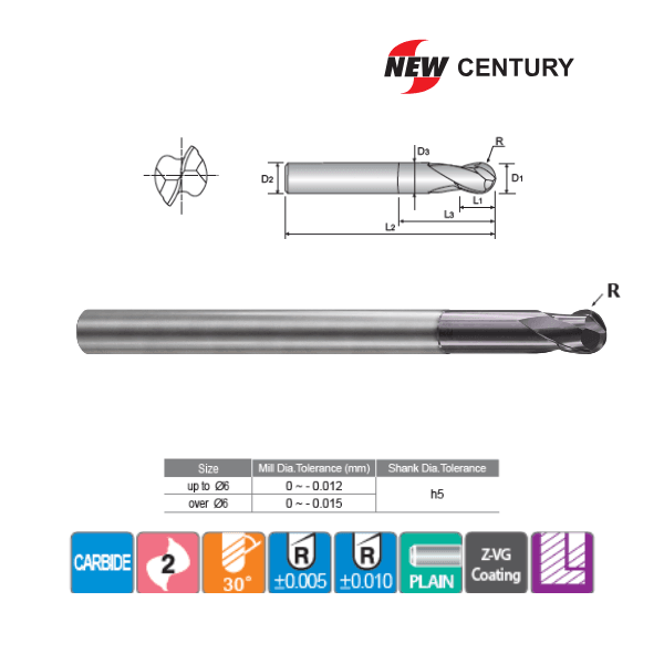 252,77 lei Fara TVAFreza carbura, ball nose, Z=2, C-coating, 20x20x30x160mm Cod: HPI90200